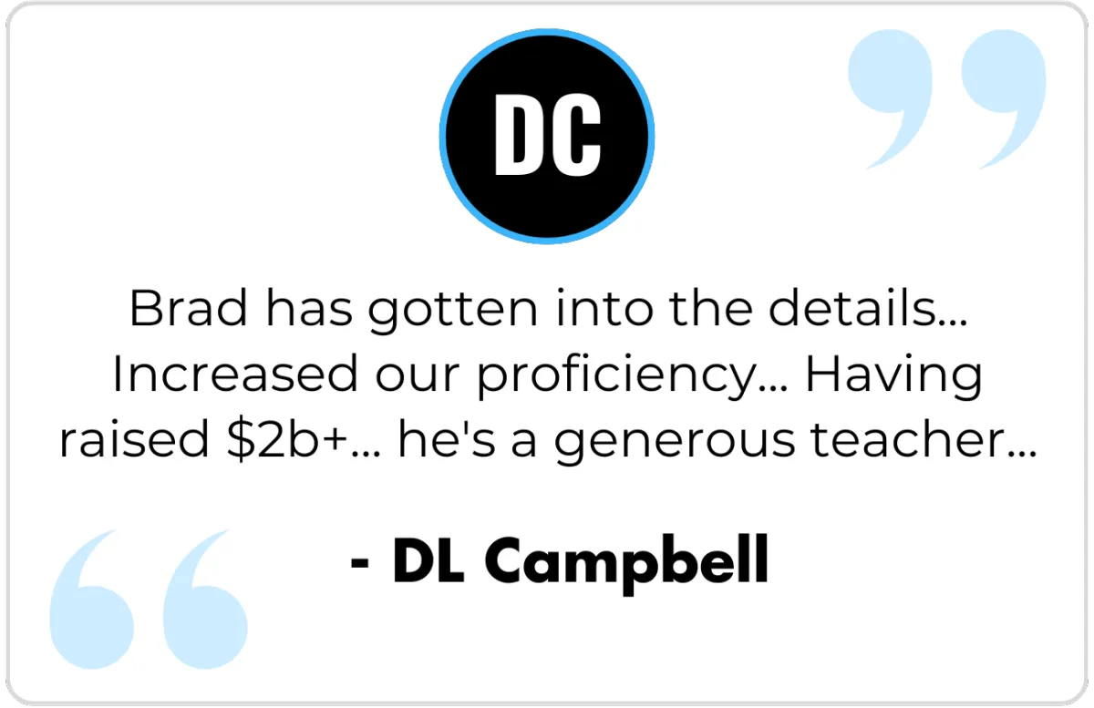 The "$2 Billion Guy." Brad isn't just a coach; he's done it – raising billions for his own ventures and major firms. He provides the structured, proven systems you need to navigate the sophisticated world of HNWIs, family offices, and institutional capital ethically and effectively. His methods are based on real-world experience, not just theory.